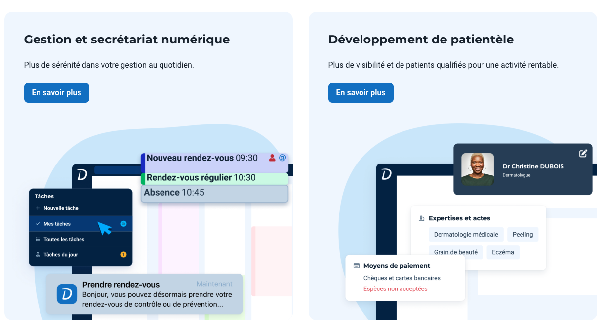 - Écosystème complet combinant prise de rendez-vous patients et gestion de cabinet dans une seule plateforme