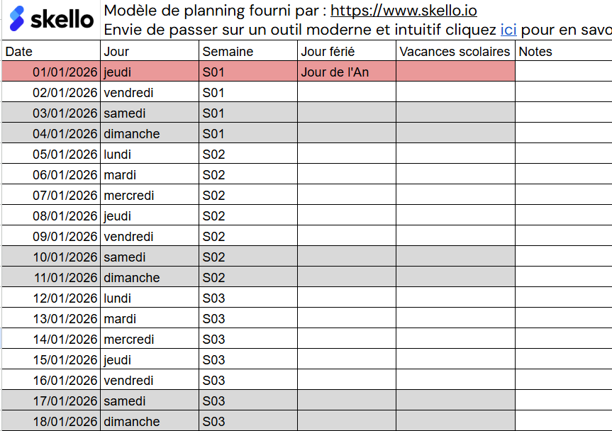 💡Conseil d’expert : Avec un planning Excel statique, visualiser le taux de présence réel sur ces semaines est difficile. Marquez dès maintenant le vendredi 15 mai 2026 en rouge pour anticiper les demandes de congés et garantir la continuité de service.