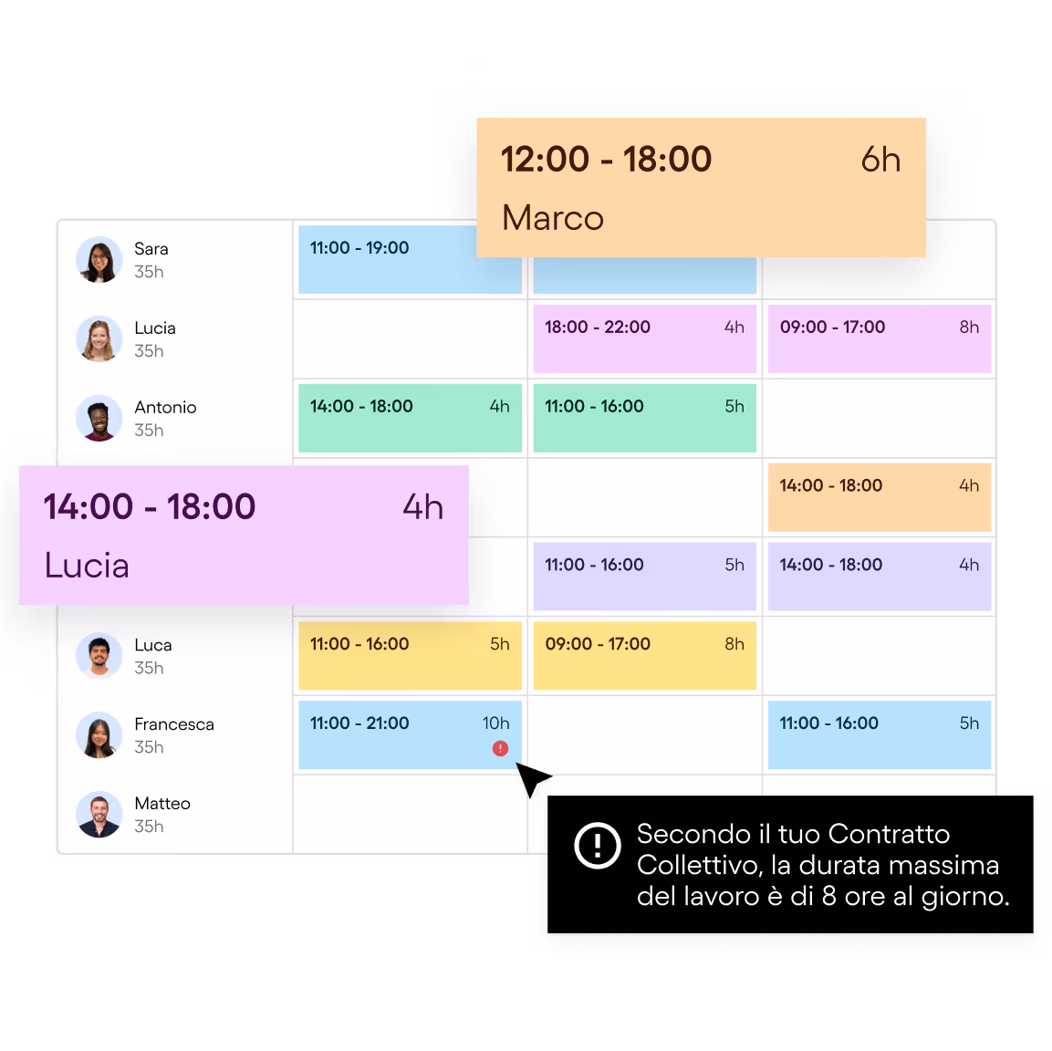 Turni, pasti, orari flessibili o annualizzati. Pianificazione su misura per la tua attività con un solo clic.
